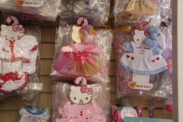 There is also this cute -of course pink- cart! If you have ever been to The Grove in L.A, there are booths everywhere, that are selling bracelets, stuffies, latop cases, everything! This is one of those, but in a shop. It contains Hello Kitty stuffy outfits and dolls, and cards and posters. The way they set it up was cute, and the dolls and care-basket being behind glass makes it look special.